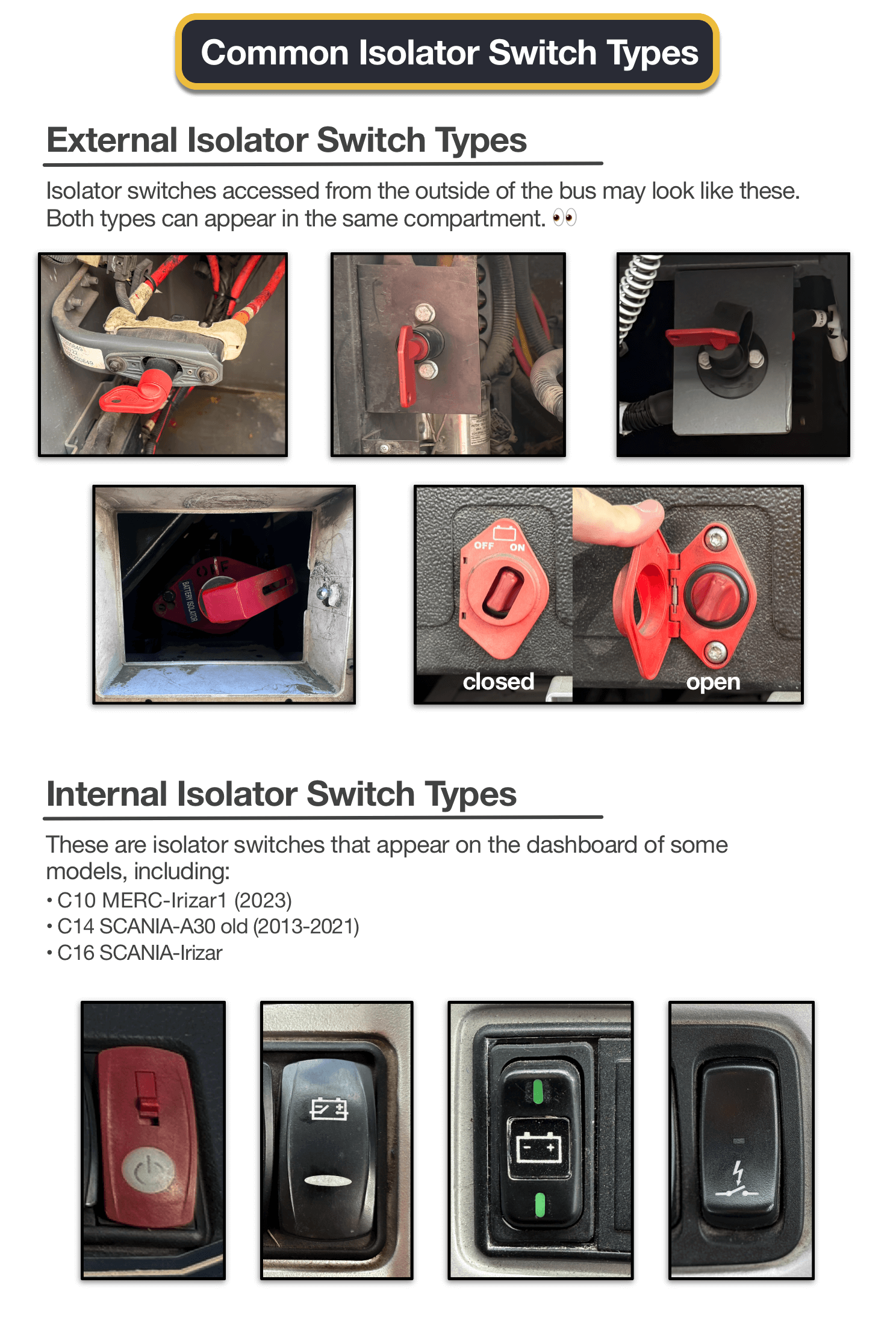 Panorama buses have several types of isolator switches and possible locations on the bus that you might find the switches.